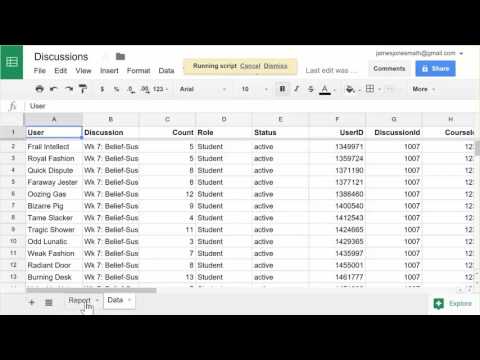 You'll notice that the UserID and DiscussionID are stored as numbers as well. This is to help eliminate ambiguity if you have to items with the same name. There is also a CourseID and CourseName field. This would allow you to gather information for more than one course. The normal process would be to just make multiple copies of the spreadsheet. One possible use would be if you're documenting student learning outcomes and want a single file. You could also add a pivot table filter for the course if you like.