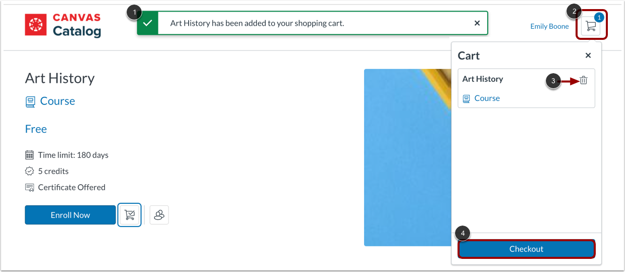 In Canvas Catalog, you can enroll in programs and courses from your institution's home page. Selected listings display in your shopping cart where they remain until you check out.