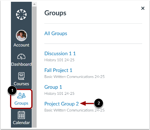 In Global Navigation, click the Groups link [1], then click a group name link [2].