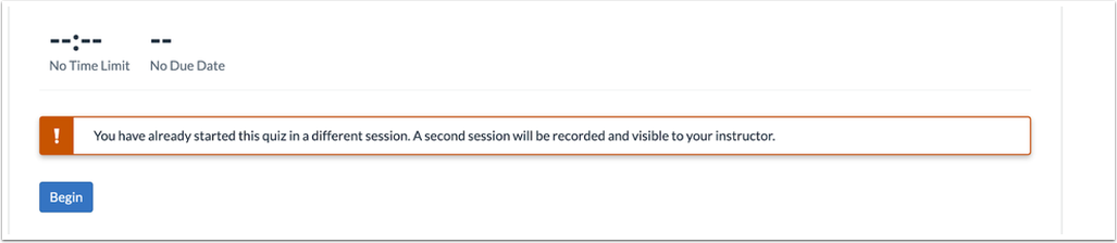 If you start a New Quiz session on one device or browser and then attempt to access it from another, a banner displays notifying you that your multi-session activity will be recorded and visible to your instructor.