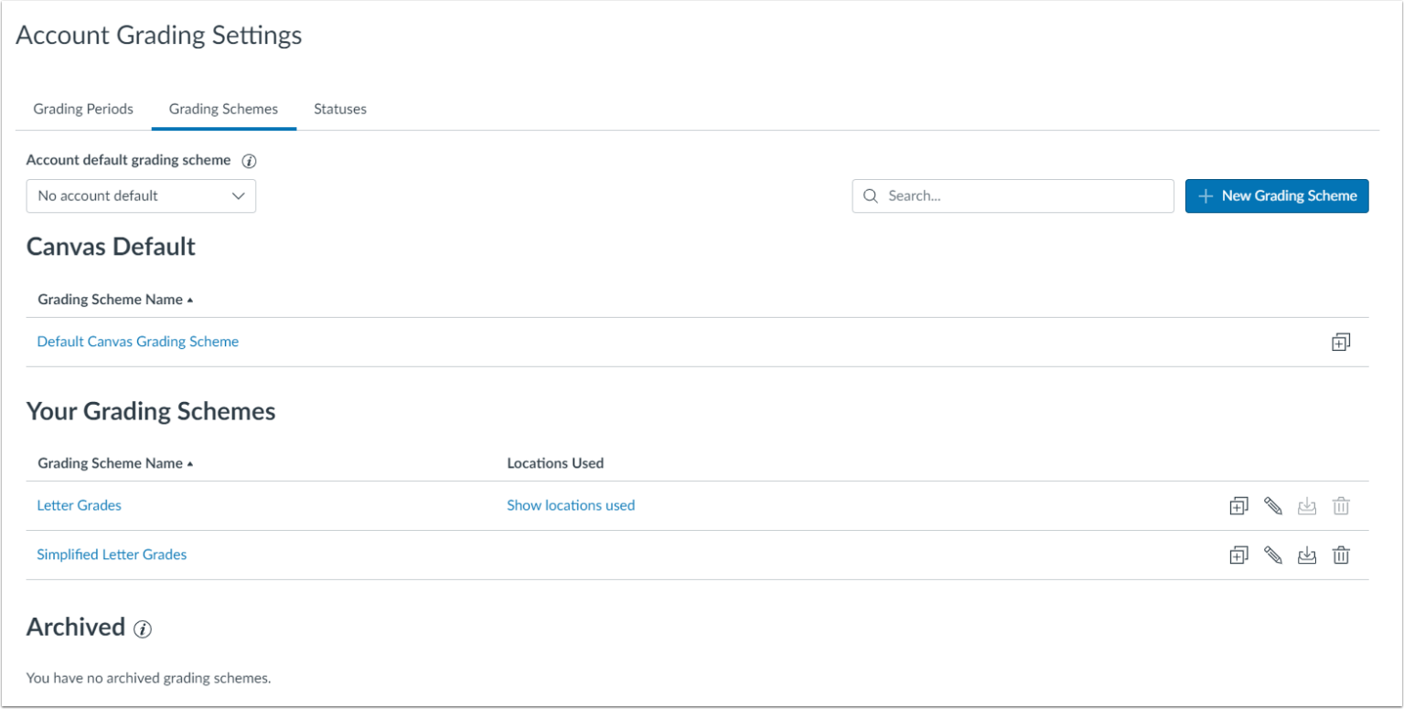 - A grading scheme created at the account level cannot be deleted, archived, or edited at the course level.