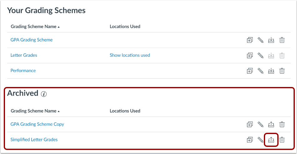 View the archived grading scheme. To unarchive and restore the grading scheme, click the Unarchive icon.