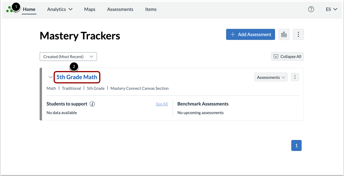 To view the assessments within a standard or group, click the Expand button [1]. View the assessment list [2].