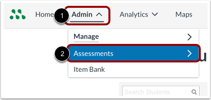 In the Global Navigation menu, click the Admin drop-down menu [1]. Click the Assessments option [2].