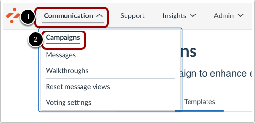 In the Global Navigation, click the Communication dropdown menu [1]. Then click the Campaigns link [2].