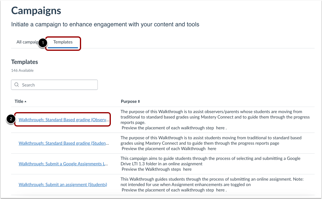 Then locate and select the walkthrough campaign template you are interested in using [2].