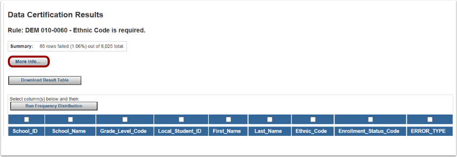 To see details about a rule when viewing the Data Certifications Results, click the More Info button.