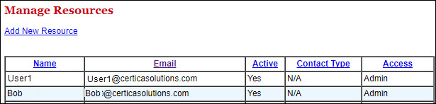 From the Projects menu, select Manage Resources to create or edit user accounts. The Manage Resources page appears.