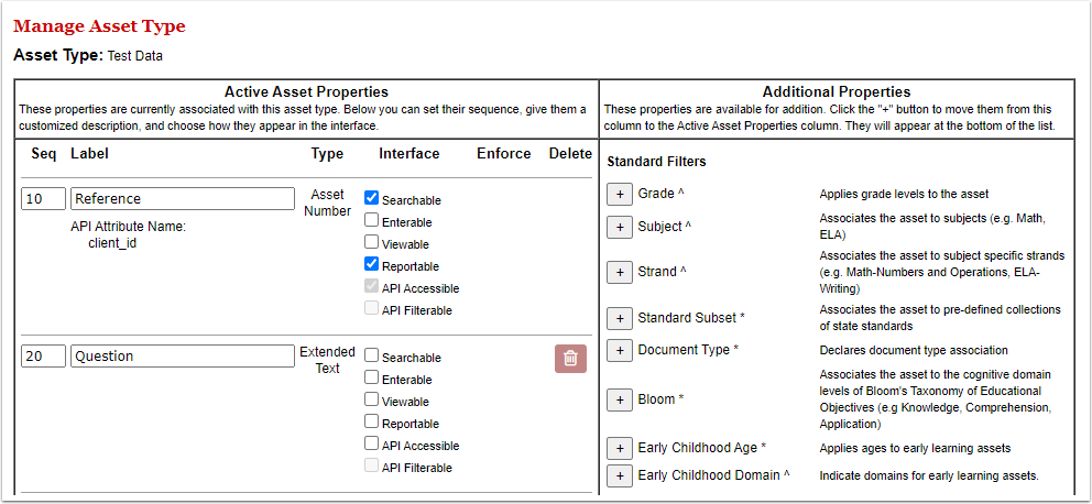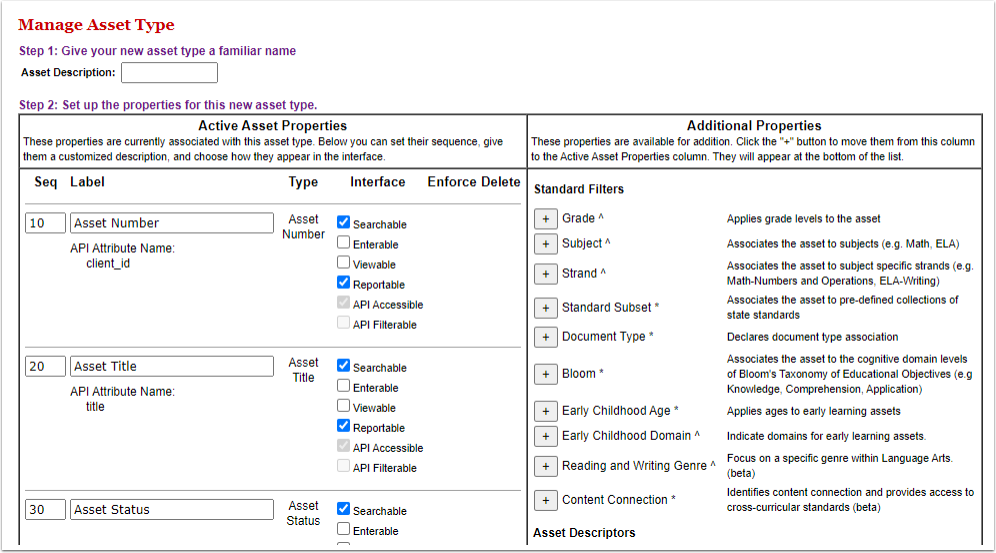Additional Properties - You can also select properties such as Grade, Subject, Course, etc. To add a property, click the + sign next to the property as it is listed on the right side of the page. This specifies what fields you would like that type of asset to display when adding a new Asset Type into the system.