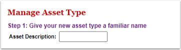 Step 1: Give your Asset Type a familiar name/description. This is the name that appears under Asset Type on the Manage Assets screen.
