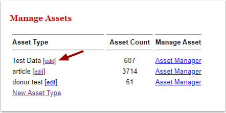 If you click the edit link to the right of an Asset Type, the Manage Asset Type page appears.