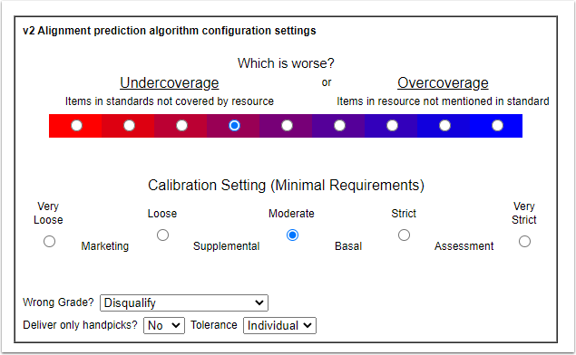 Step 4 (optional): If you use version 2 of the prediction engine (v2) when aligning an asset: Set up the alignment prediction algorithm of the new Asset Type. This section is used to determine how to calibrate the Asset Type to the standards. Do you want to align to standards that are exact matches, or align to those which loosely match the asset? There are a number of possibilities for setting up the alignment management for your assets.