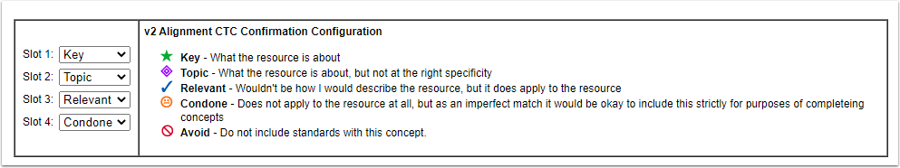 Step 3: If you will use version 2 of the prediction engine (v2) when aligning an asset: Determine which confirmation types to use in the alignment of this Asset Type. The typical set up is shown below using Key, Topic, Relevant, and Condone (in that order).