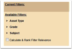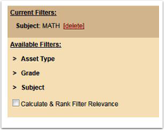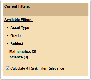If the Calculate & Rank Filter Relevance box is checked when you open a filter, only the appropriate options will be displayed, along with the number of assets in parentheses next to it. For example, if you open the Subject filter with Calculate & Rank Filter Relevance checked, Math will not be listed if there are no Math assets.