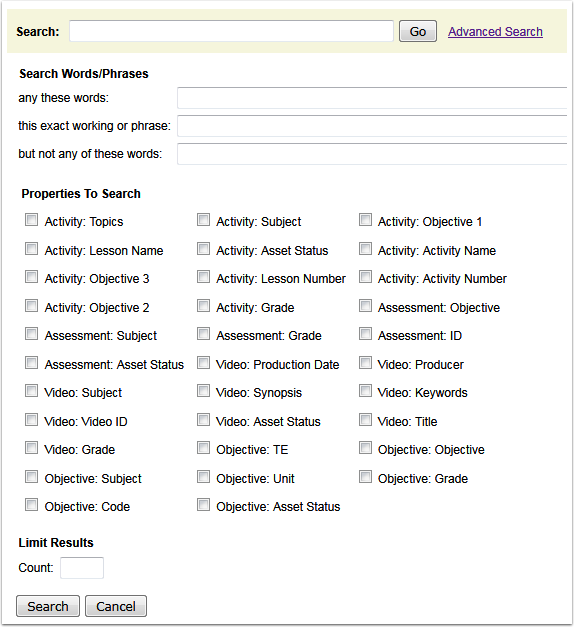 In the Advanced Search screen you can search any of the properties in the assets in the account. A list of those properties is at the bottom of the screen. Check the boxes next to the asset properties that you would like to search.