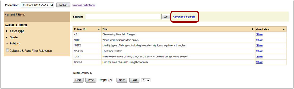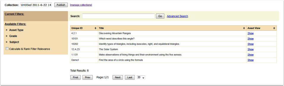 On the Asset Collection screen, there are several search options to select a group of assets. On the left side of the screen, you can select assets by grade, subject, asset type or any other asset property that is searchable.