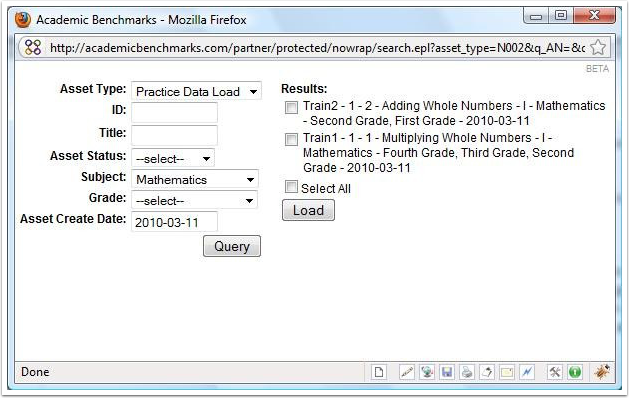 - Below, the aligner has searched for all Mathematics Assets. The results are displayed on the right of the window. Check the assets you would like to load, and click Load.