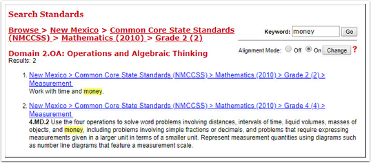 5. Once you select a grade, the top levels (strands) of the document are displayed. At the top right hand of the screen, you also see "Alignment Mode."