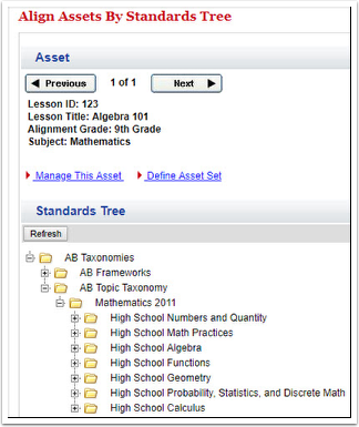 From the Projects menu, select My Assignments and click on a current assignment. The Align Assets by Standards Tree page appears.