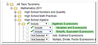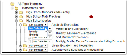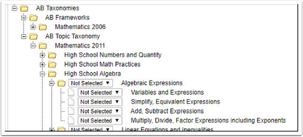 The primary way to apply topics to an asset is by using the Standards Tree alignment system. This system consists of a series of folders which you click open to drill down to the deepest level of the AB Topic Taxonomy.