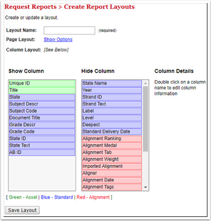 Column Layout The "Show Column" lists fields that will be shown in the report. The "Hide Column" contains fields that are hidden and not displayed in the report. Note: Only fields that are marked "Reportable" in the Asset Type will be available for use in a layout. The fields are color coded according to the property type displayed. Green indicates that the property is from the assets. Blue indicates information from the standards document. Red is information about the alignments.