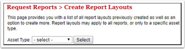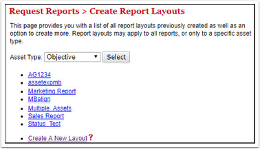 - Click Select. Any layouts that you have for that Asset Type are listed, along with a link for creating a new layout.