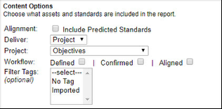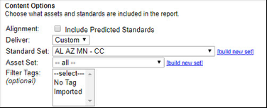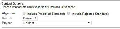 - Alignment: Click "Use Predicted Standards" if you want the report to use alignments predicted by the system, usually based on concepts and on other settings if your account is set to deliver them. Click "Include Rejected Standards" if you would like the report to include rejected standards.
