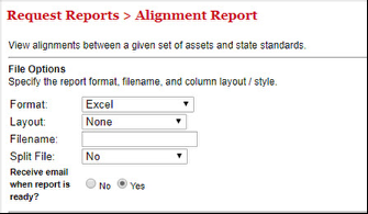 An Alignment Report shows every asset that has an alignment to a standard in a given state and subject. If there are multiple alignments to an asset, the asset information will be repeated in a different row with the new standard information.