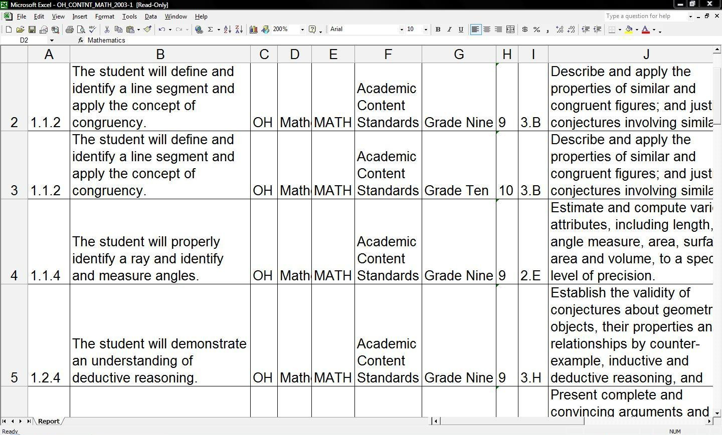 In the example below, the Unique ID 1.1.2 is aligned to two standards and appears on two rows.