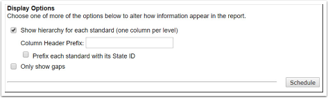 "Show hierarchy for each standard" generates one column for each level in the hierarchy of the reported standard. For example, if the standard is in the fourth level of the document, there will be four columns - one for each level.