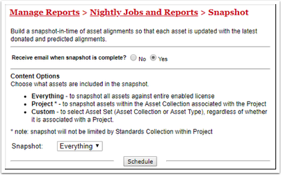 1. Choose Reports to go to the main Manage Reports page, and then click the link for Snapshot Job, located in the "Nightly Jobs and Reports" section. The Snapshot page opens: