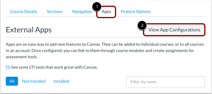 You can also verify that the External Tool is added in your course. In Course Settings, click the Apps tab [1]. Then click the View App Configuration button [2].