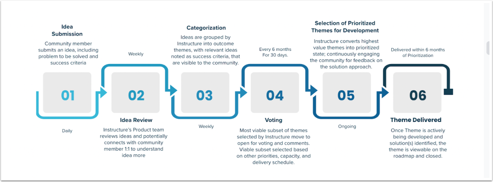 Input from existing users is a very important part of how Instructure prioritizes work on new and existing features and fixing bugs. Instructure looks at data from the support team, feedback from Customer Success Managers (CSMs), and from the Community directly. Learn more about starting idea conversations and the development process.