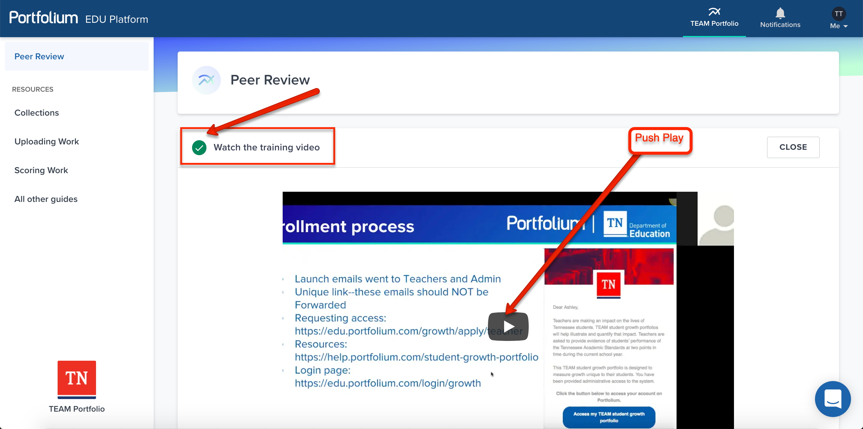 Simply click on 'Watch the training video', and then click play. After you have watched the video, you will see a green check mark signifying you have completed this step and can move on the to the certification exam.