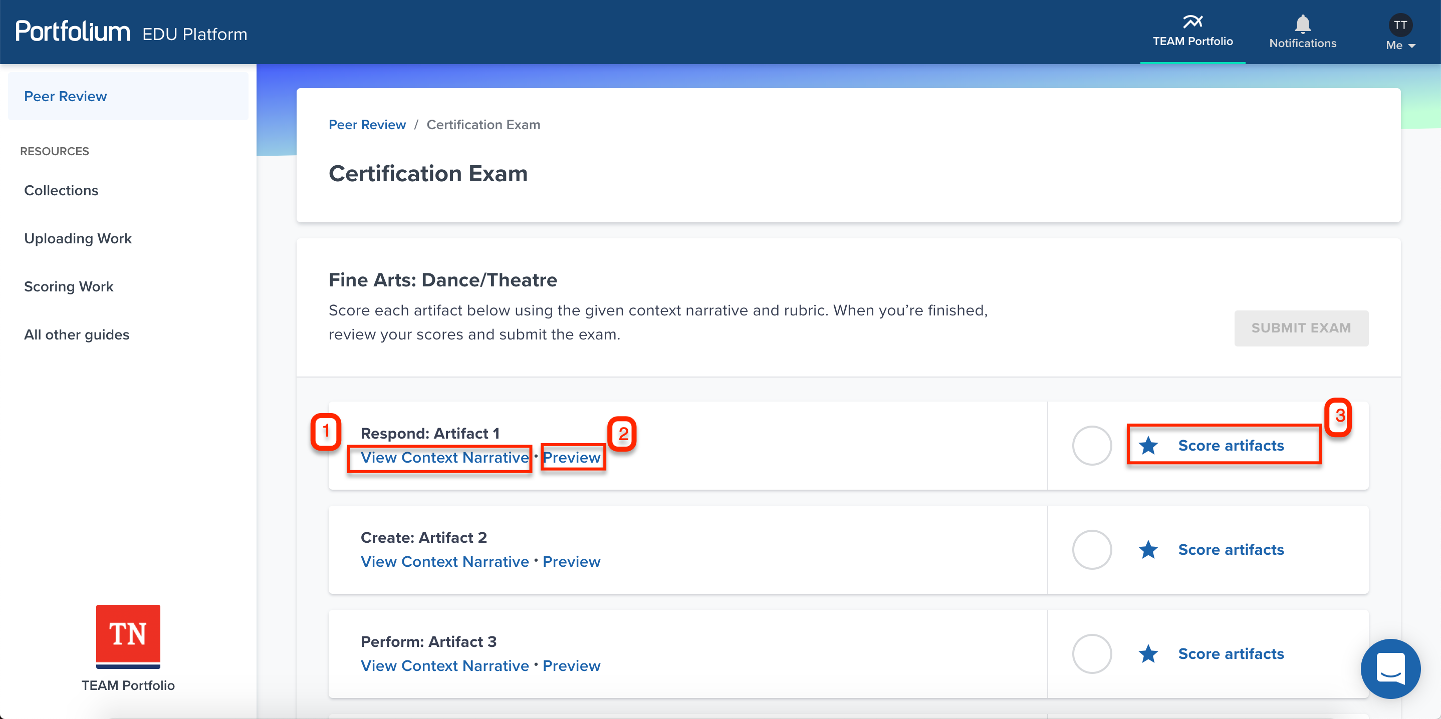 - When you click 'Score artifacts' you will be taken into the scoring modal to complete the scoring for this portion of the exam.
