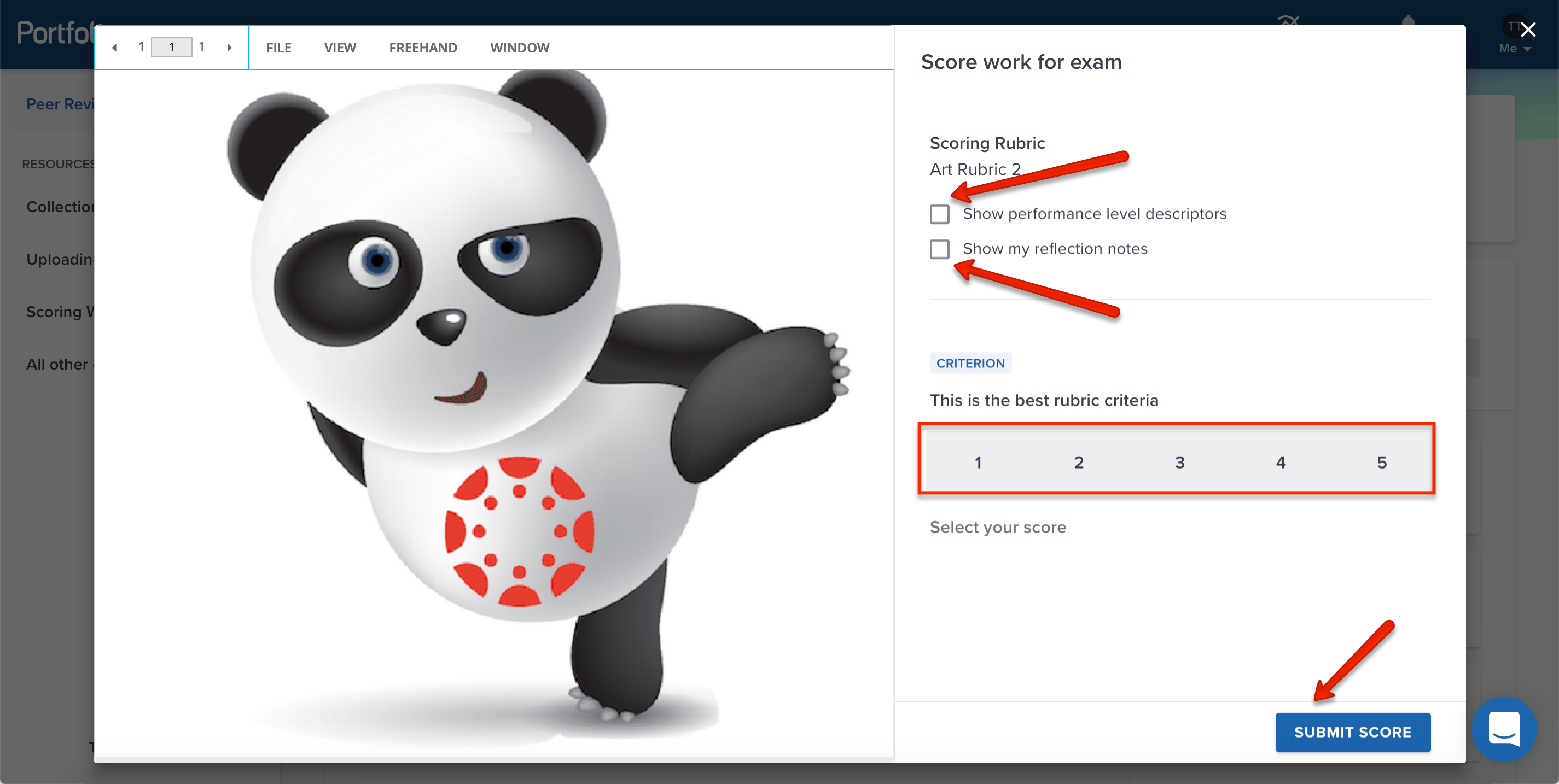 Once you are within the scoring modal, you can select to 'Show performance level descriptors' which will provide details to you on what each performance level descriptor stands for as you score.