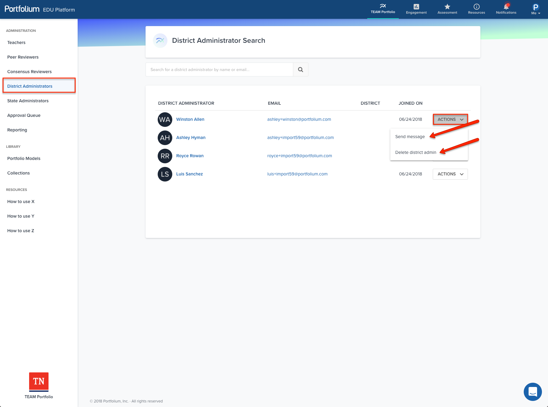 You are also able to utilize the 'Actions' button to send a specific District Administrator a message or delete their access.