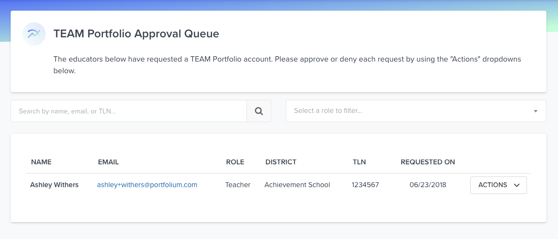 Within the 'Approval Queue', you will see a list of educators that have requested access to a Student Growth Portfolio account.