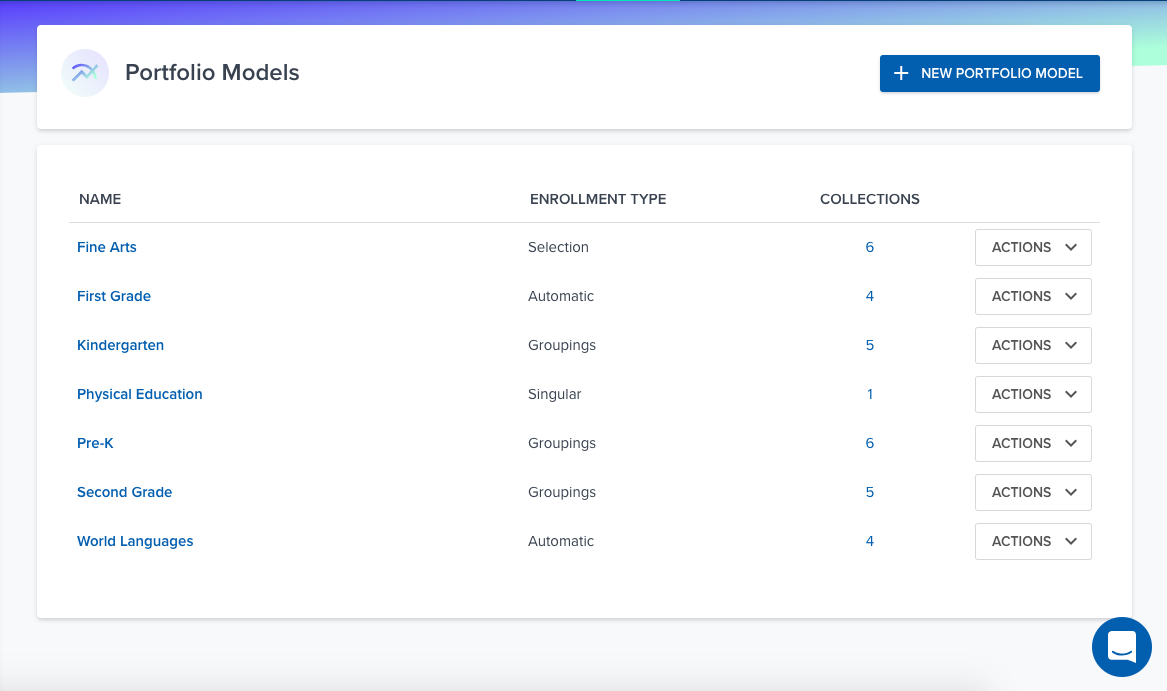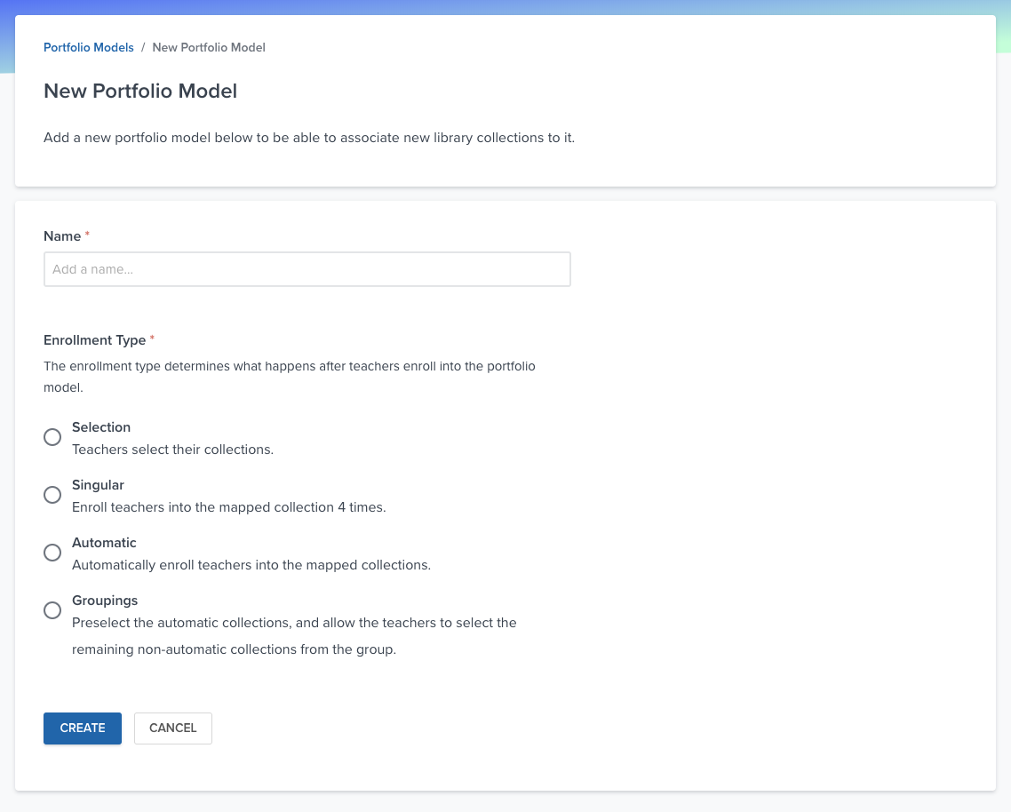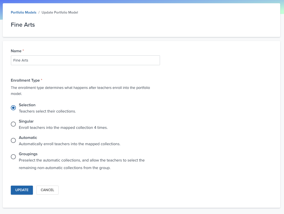 When you select 'Update portfolio model' you have the opportunity to update the name of the model as well as the 'Enrollment Type' associated with it.