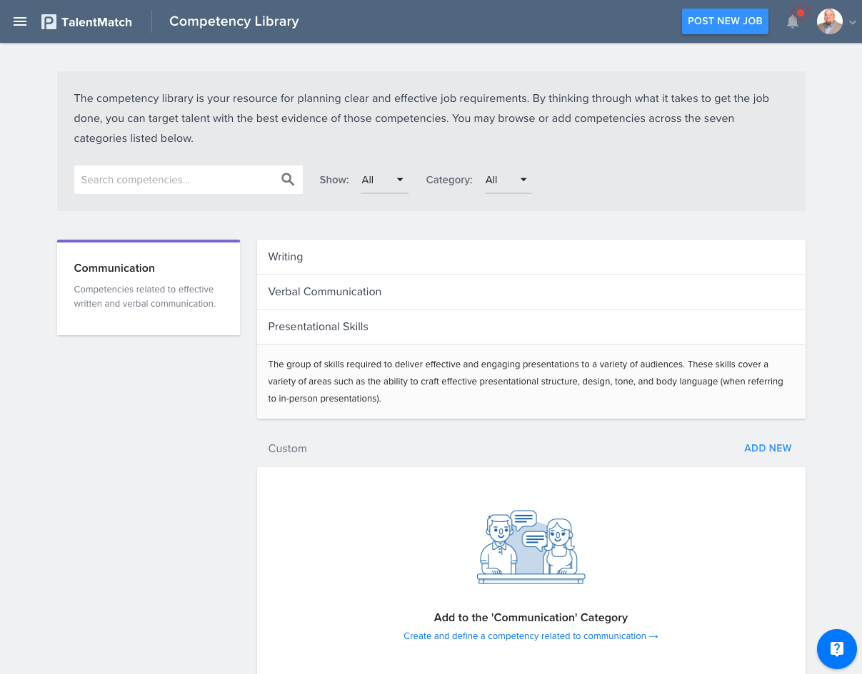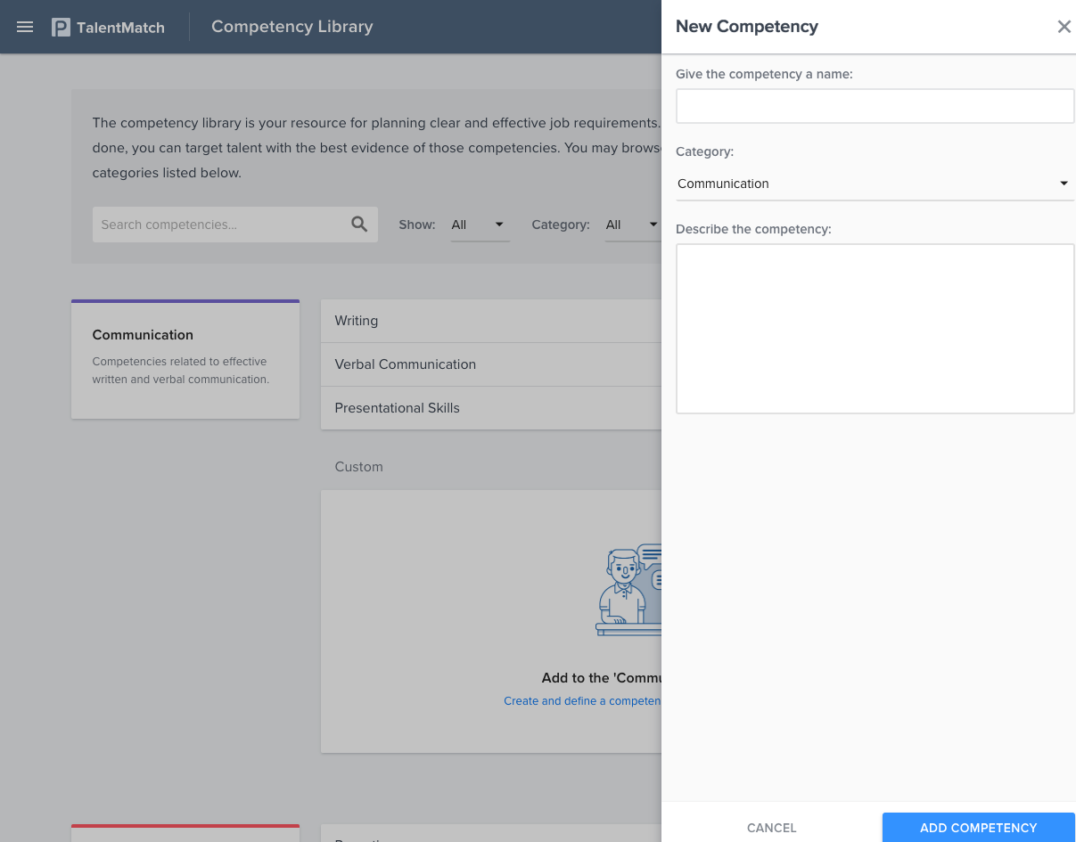 The competency library is your resource for planning clear and effective job requirements. By thinking through what it takes to get the job done, you can target talent with the best evidence of those competencies. You may browse or add competencies across the seven categories listed below.