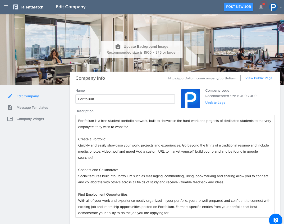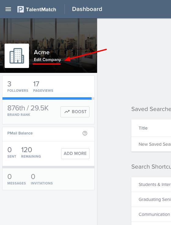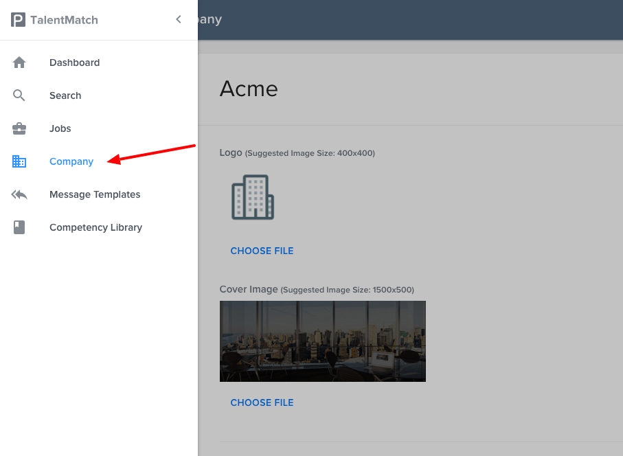 When logged into TalentMatch, you'll see the Company tab in the slideout navigation bar. Visit the Company section to edit your company account, see your company's website widget, and view other company information and settings.