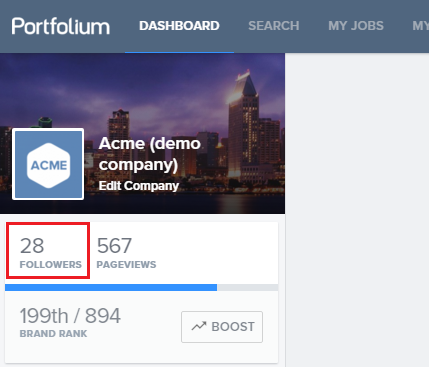 From the TalentMatch dashboard you can see the number users following your company. You may also click on that number to see a list of search results that includes those users.