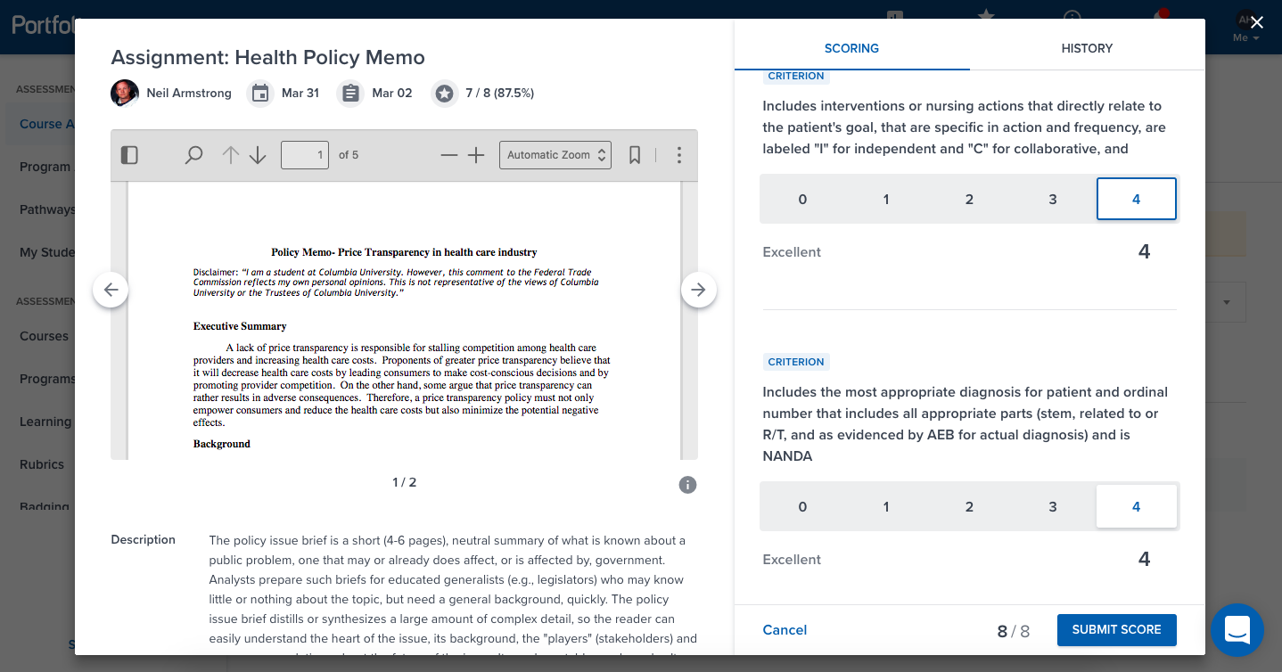 Within the LMS, the feedback and scoring you provided via Portfolium is pulled directly into the gradebook.