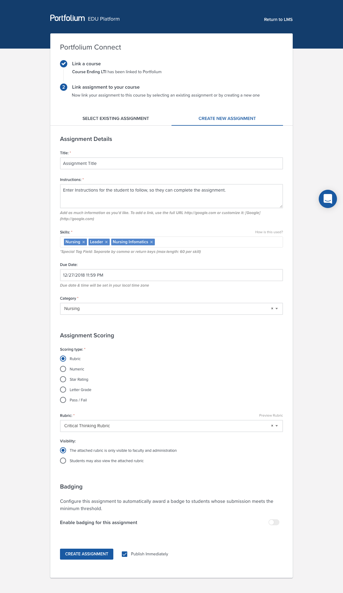 - Publish Immediately - By default, the publish "ON" button is enabled. You have the option to control the status of the assignment on the Portfolium end.