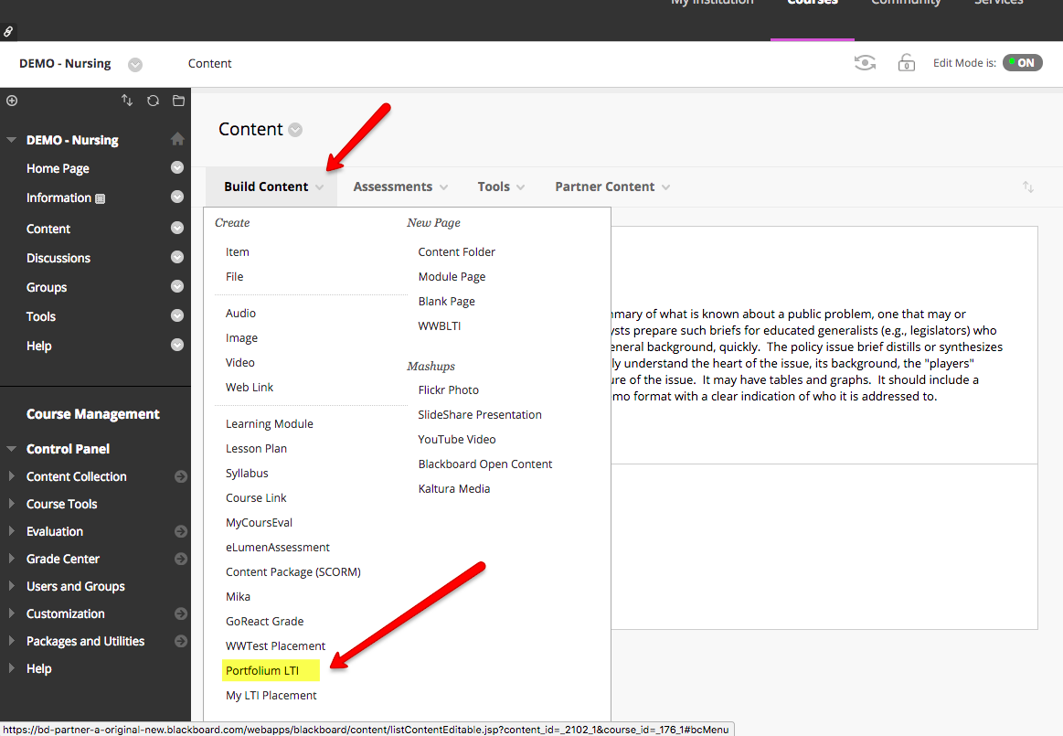 3. Add a new Assignment by clicking on the “Build Content” menu and click on the Portfolium LTI link.