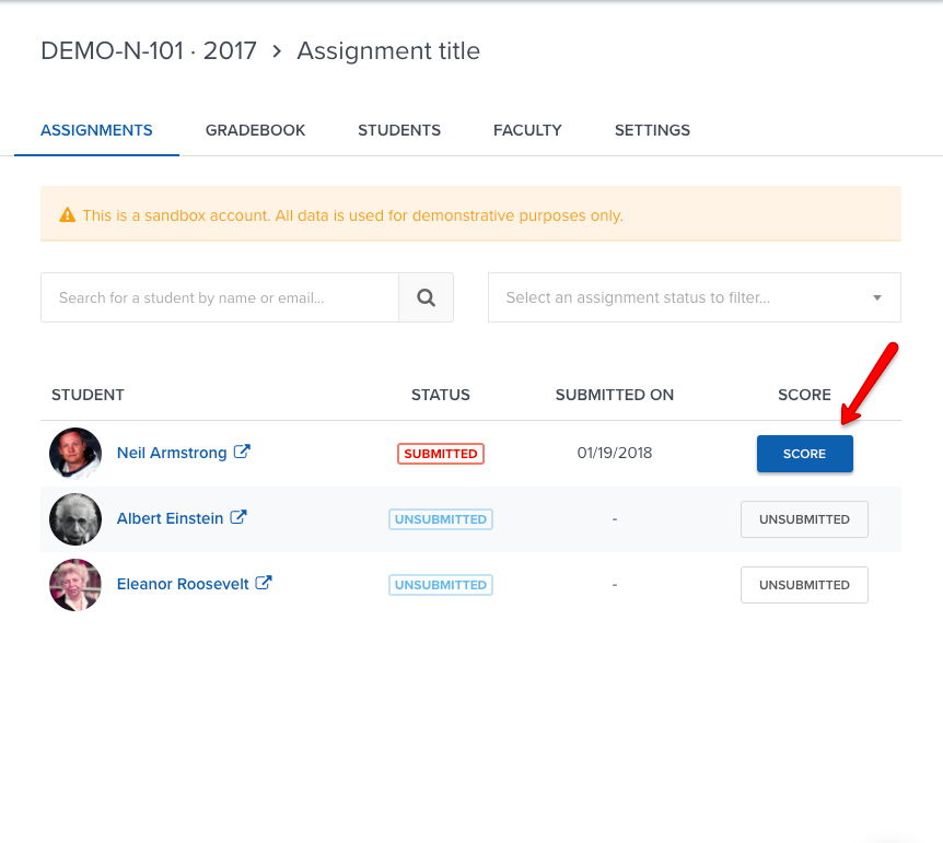 You will be sent to the assignment detail page within the EDU Portal. This page, shows the list of students associated with their assignments and the assignment status. Those assignments with a status of “submitted “are ready to be assessed. Click on the “Score” button.