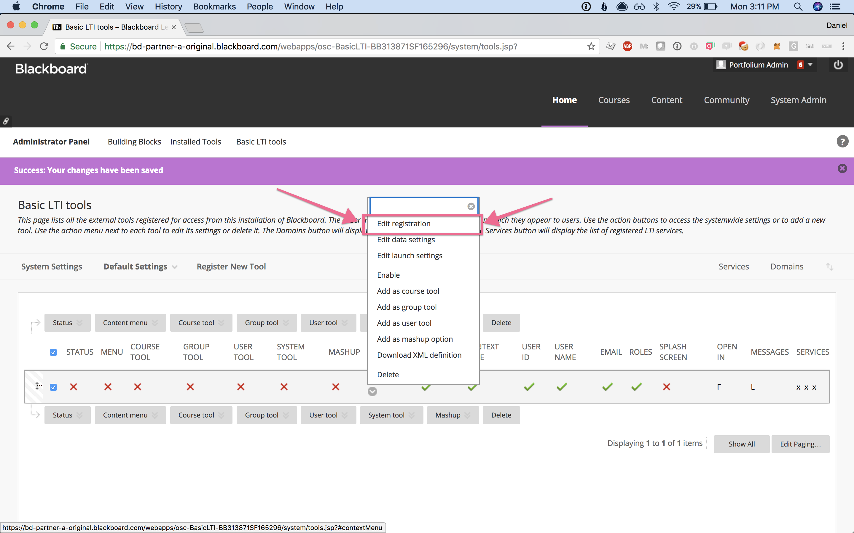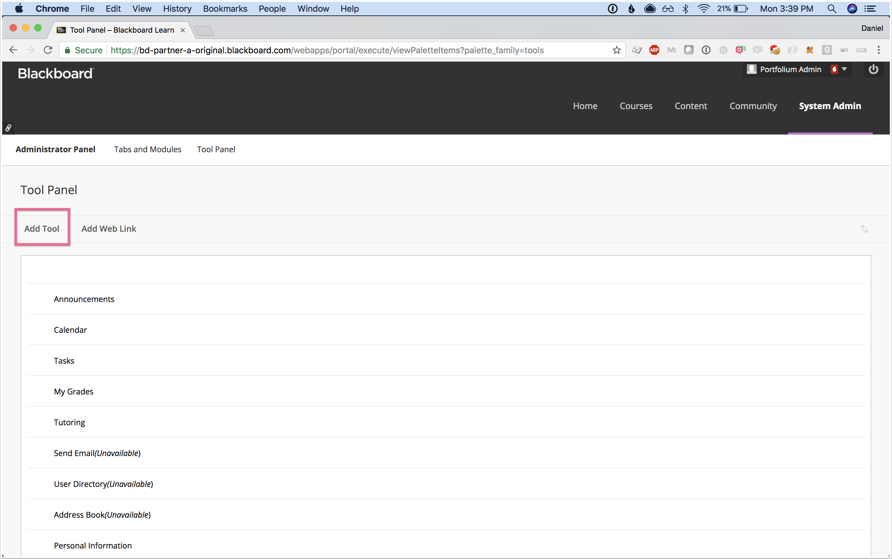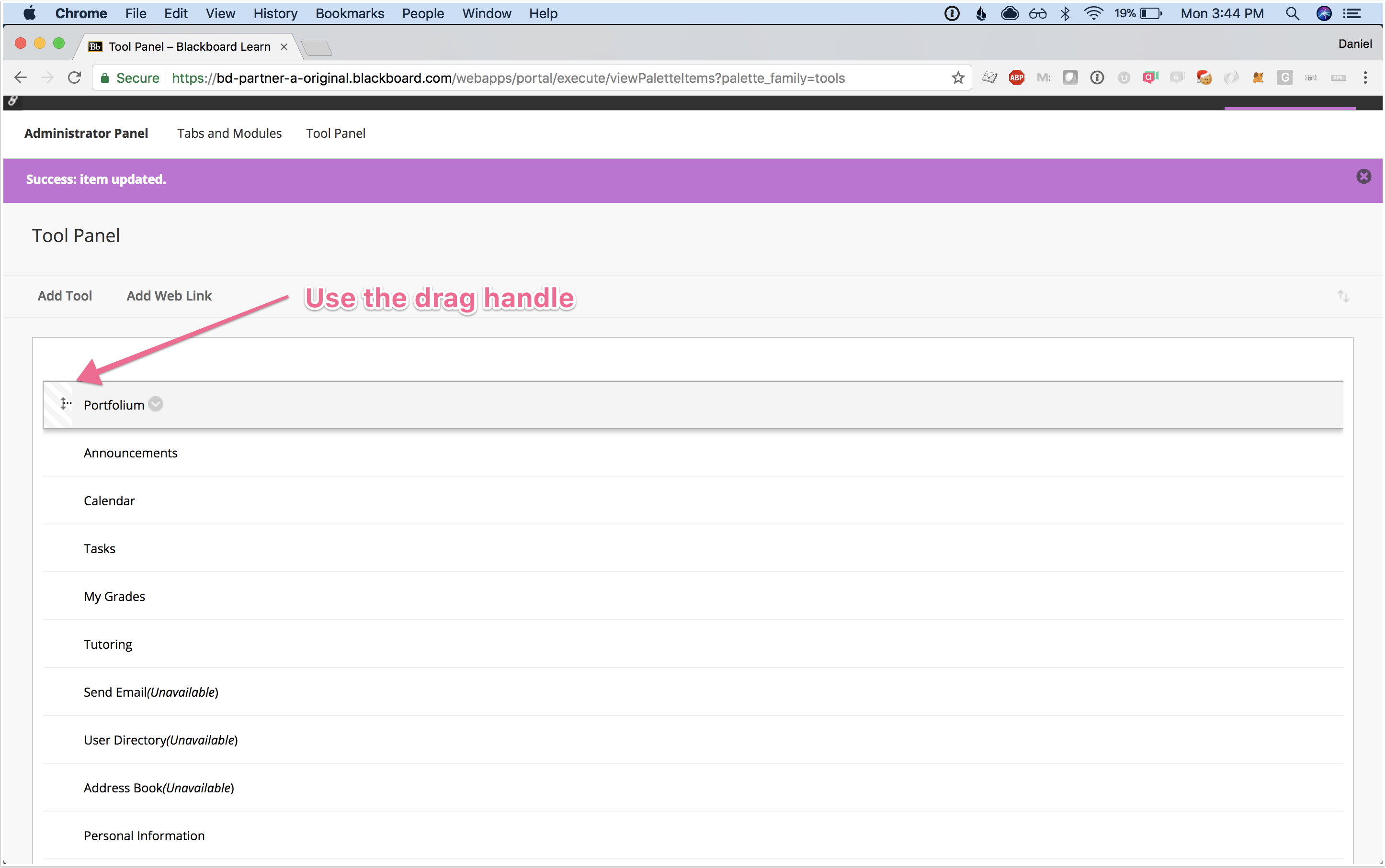 Step 4:Drag & drop the new Portfolium tool link to the position you want it displayed in the list.