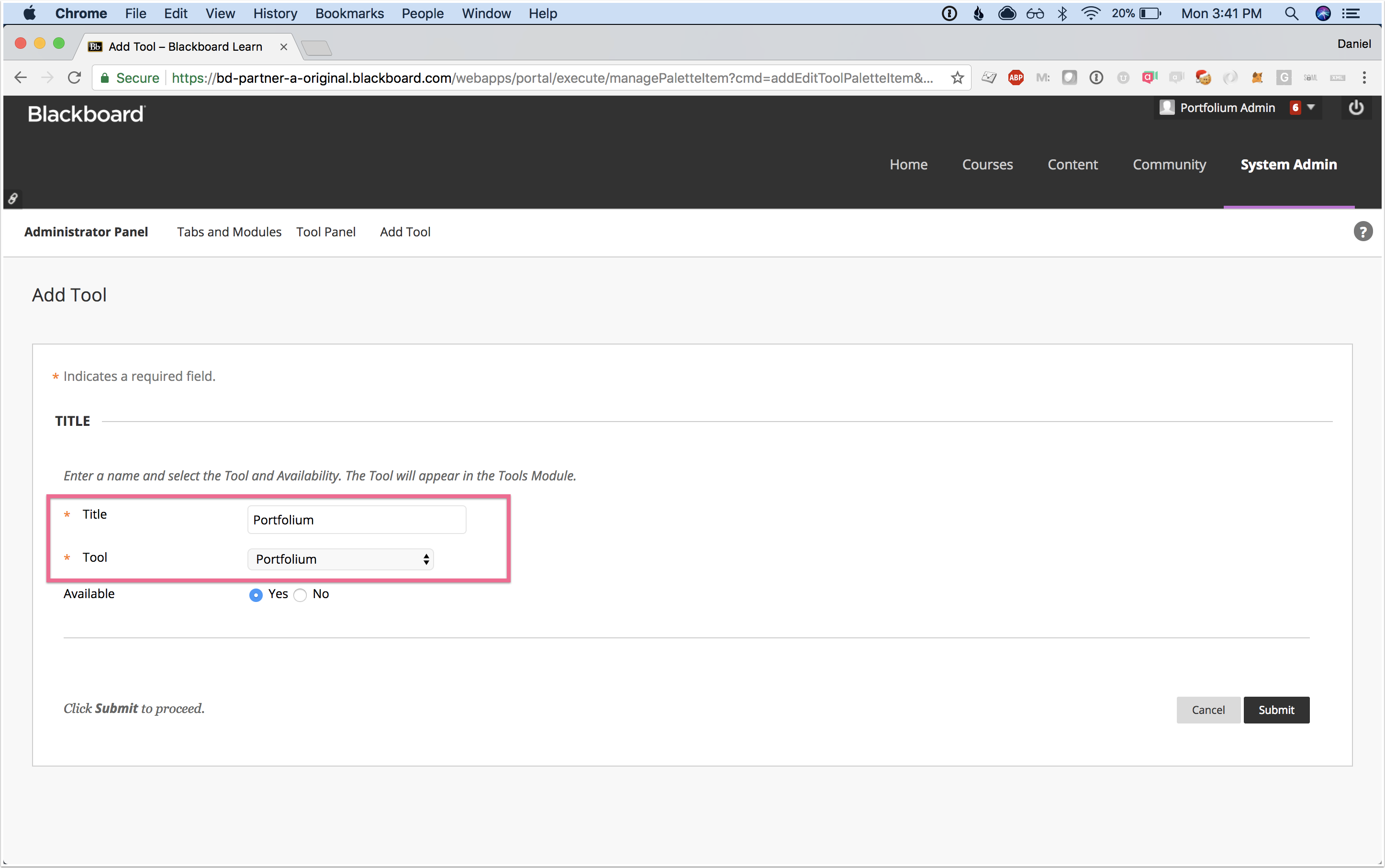 Step 2:Add a new tool to the panel, and select the new "Portfolium" tool that was created.(Hint: we recommend naming it "Portfolium")