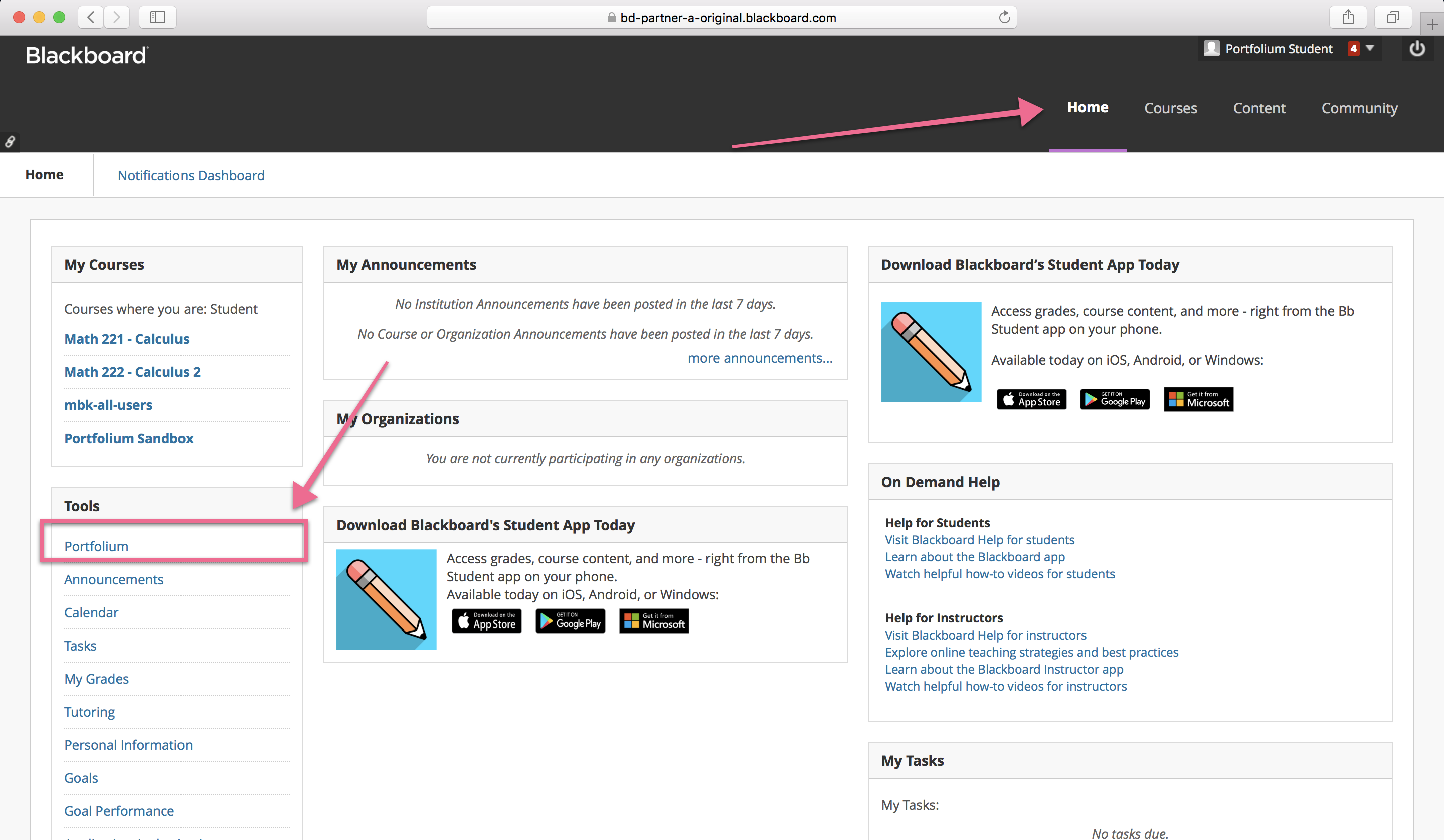 By default, the Portfolium LTI SSO link shows up in the course sidebar. If you want Portfolium to be installed in a Tools menu on the home page, then you need to install the Basic LTI Building Block by Stephen Vickers.