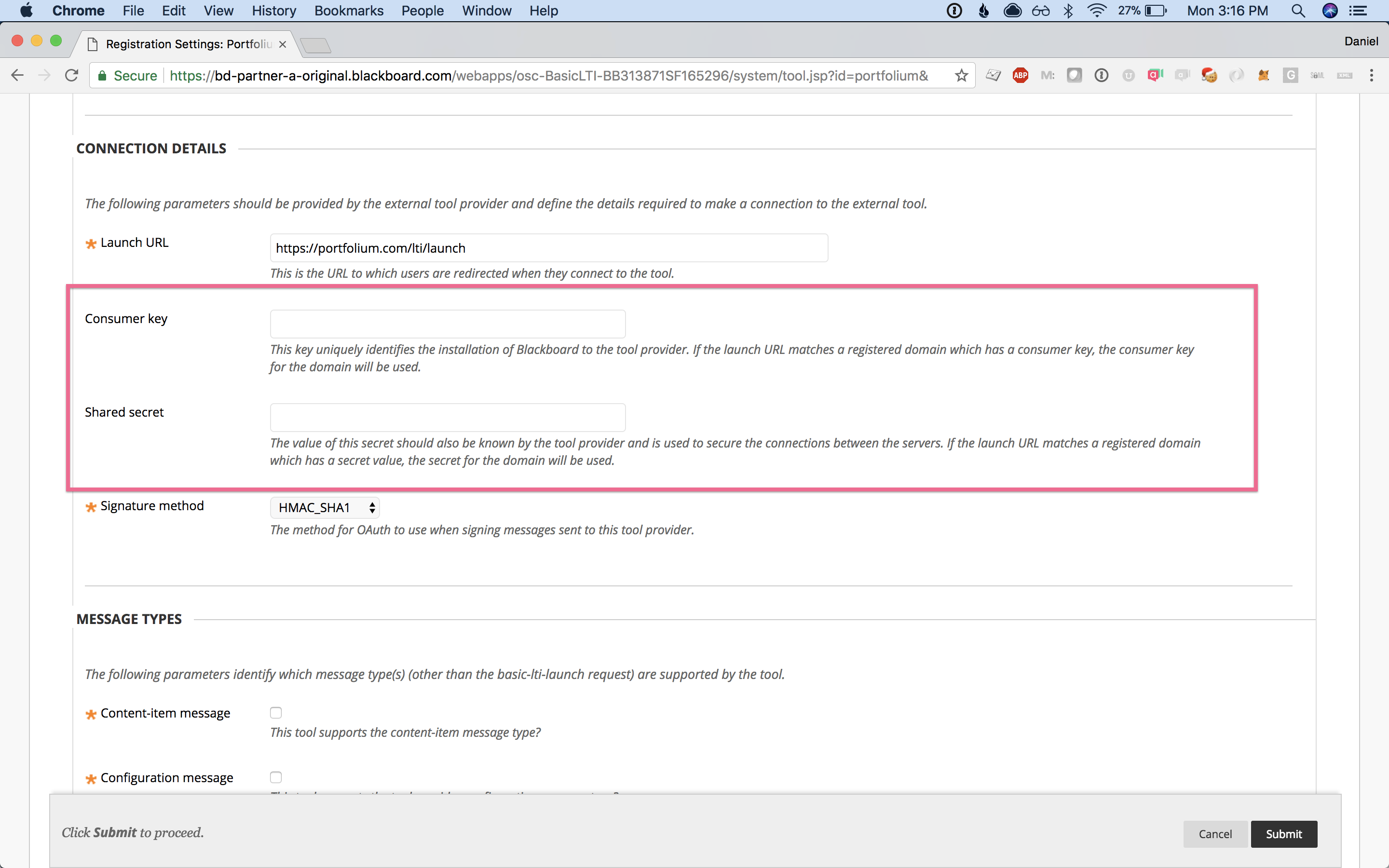 Step 7:Add the Consumer Key and Secret in the "Edit registration" settings for the tool.